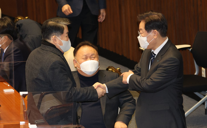 ▲ 더불어민주당 이재명 대표가 지난달 11일 오전 서울 여의도 국회에서 열린 본회의에서 이상민 의원, 김경협 의원과 인사하고 있다. [연합뉴스 자료사진]