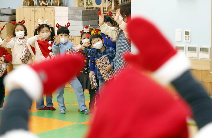 [열린의정뉴스 = 김윤영 기자] 성탄절을 하루 앞둔 24일 오전 광주 북구청직장어린이집에서 아이 몰래 산타 복장 착용한 학부모들이 준비한 선물을 받고 아이들이 기뻐하고 있다. 2021.12.24