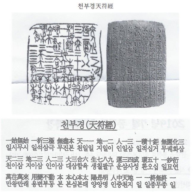 첫째, 환국 시대 때 나온 「천부경天符經」이 있습니다. ‘천부’란 ‘우주를 통치하시는 상제님의 하늘 법도’라고 할 수 있습니다.