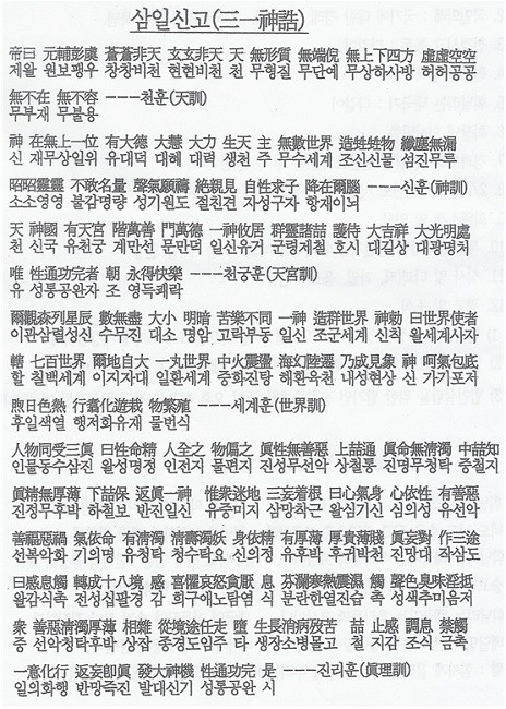 한민족 3대 소의경전 所衣經典 : 천부경, 삼일신고, 참전계경이 있다.