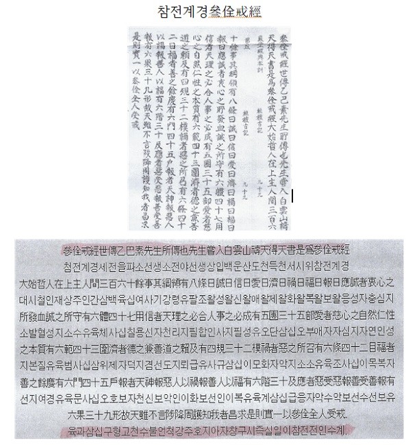 셋째, 「참전계경參佺戒經」이 있습니다. 오늘날 흔히 말하는 ‘참전계경’은 고구려 9대 황제 때의 재상, 을파소가 기도를 해서 하늘로부터 받아 내린 366조목을 말합니다. ‘참전’은 참여할 참參 자에 신선이름 전佺자인데, 이 전 자는 사람 인人변에 온전 전全자를 했스빈다. 그러니 ‘참전’은 ‘완전한 인간이 되는 그 길에 하나된다’는 뜻이지요. 곧 참전계란 완전한 인간이 되기 위해 지켜야 계율이고, 그 참전계를 기록한 경이 참전계경입니다. 이 경은 우리 한민족의 윤리 교과서라고 할 수 있습니다.