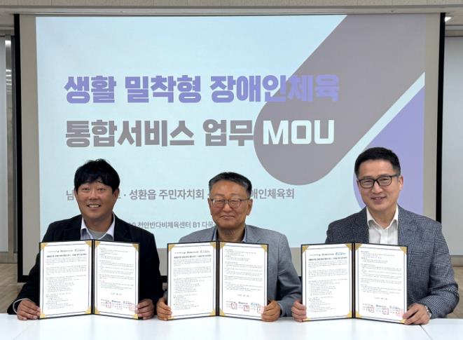 [코리아 이슈저널=홍종수 기자] 천안시장애인체육회는 22일 천안반다비체육센터에서 성환읍 주민자치회, 남서울대학교와 ‘생활밀착형 장애인체육 통합서비스 구축을 위한 업무협약’을 체결했다.