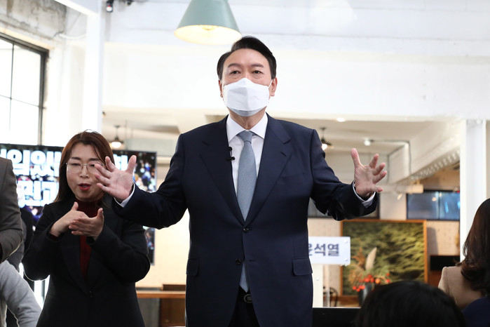 ▲ 국민의힘 윤석열 대선후보가 11일 오전 서울 성동구 할아버지공장 카페에서 '진심, 변화, 책임' 신년 기자회견을 마친 뒤 취재진의 질문을 받고 있다. 2022.1.11 [국회사진기자단]