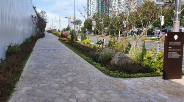 구는 지난 5월부터 삼성동 경기고등학교 옆 400m 담장(7호선 청담역∼9호선 봉은사역 구간) 따라 자연 친화 산책길 조성을 위해 정비에 나서 스타일 브랜드 '미미위강남' 조형물과 나뭇잎 형상의 그늘막을 설치하고 비비추, 배롱나무 등 2만5천 본의 화훼류를 심어 휴게공간으로 탈바꿈시켰다.