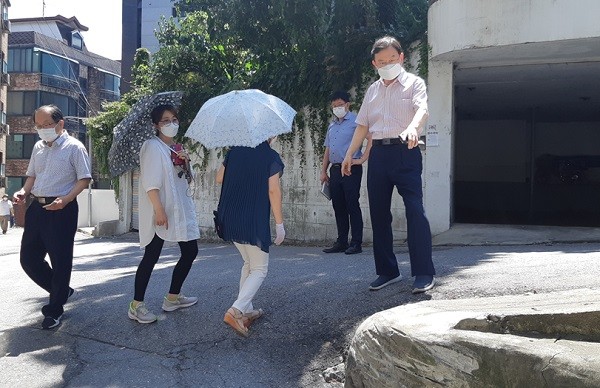 | ▲ 사당 남부순환로257길 도로 폭 협소구간을 현장조사하고 있는 박기열 서울시의원(오른쪽)[출처=서울시의회] |