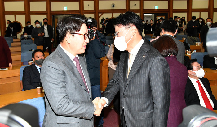 ▲ 7일 국회 의원회관에서 열린 국민의힘 친윤(친윤석열)계 의원들이 주축이 된 공부 모임 '국민공감' 첫 모임에서 권성동 의원(왼쪽)과 장제원 의원이 악수하고 있다. 2022.12.7