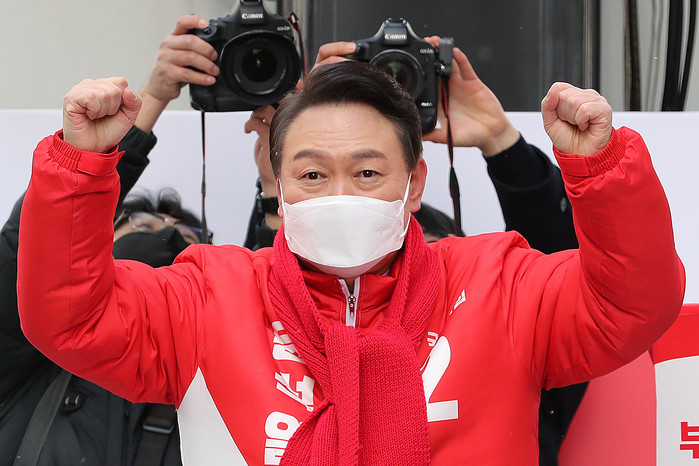 | ▲ 국민의힘 윤석열 대선 후보가 15일 오전 서울 청계광장에서 열린 '국민이 키운 윤석열' 출정식에서 지지자들의 환호에 두 손을 들어 답하고 있다. 2022.2.15 [국회사진기자단] |
