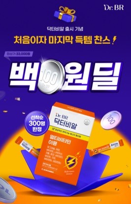 이번 이벤트는 19일 오전 10시부터 닥터비알 네이버 스토어에서 진행되며, 선착순 300명에게 신제품 〈멀티비타민 이뮨〉을 파격가 100원에 판매한다. 아이디당 1개만 구매할 수 있으며, 준비된 물량이 소진되면 조기 종료된다. 해당 제품은 비타민과 미네랄 등 필수 성분 11종을 담은 액상형 올인원 비타민으로 간편하게 섭취할 수 있는 것이 특징이다.