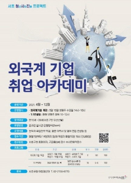 [열린의정뉴스 = 최성일 기자] 서울 서초구(구청장 조은희)는 코로나19 장기화로 인해 좁아진 취업 문을 넓히고 외국계 기업 입사를 희망하는 청년들에게 최적의 취업 성공 기회를 지원하고자 '외국계 기업 취업 아카데미'를 연중 운영한다.