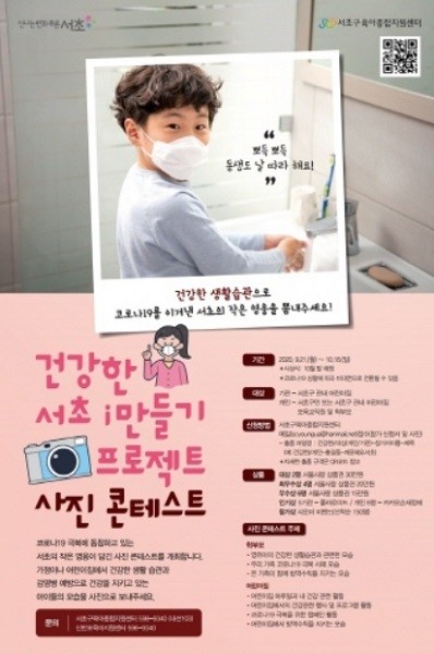 코로나19 극복을 위해 재밌고 톡톡 튀는 생활 습관으로 건강을 지키고 있는 아이들의 사진 또는 영상을 10월 18일까지 서초구육아종합지원센터(scyoungua@hanmail.net / 02-598-9340)로 접수하면 된다.