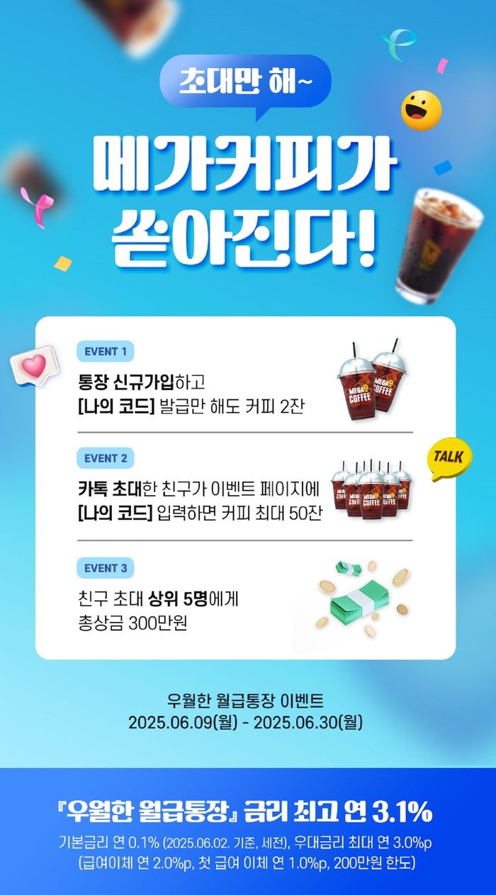 신규 가입 고객도 혜택이 주어진다. 이벤트 기간 내 통장을 개설한 고객은 메가커피 2잔을 기본으로 받고, 이후 친구 초대 시 추가로 1잔씩(최대 50잔) 받을 수 있어 최대 52잔까지 수령 가능하다.