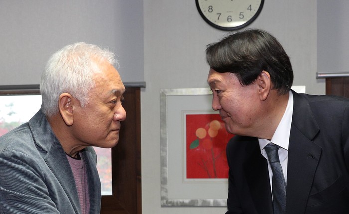 ▲ 국민의힘 윤석열 대선 후보(오른쪽)가 지난달 21일 오후 서울 용산구 김한길 전 민주당 대표 사무실에서 김 전 대표와 회동에 앞서 인사를 나누고 있다. [국회사진기자단]