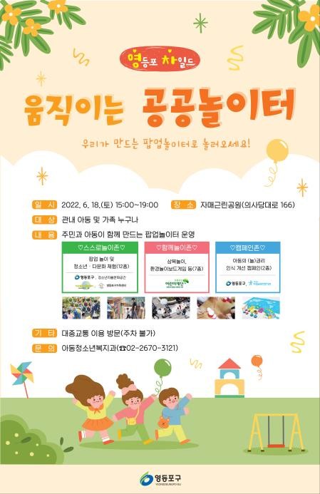 영등포구 '움직이는 공공놀이터'는 지역 내 공원, 놀이터, 운동장 등을 활용해 어린이에게 놀이환경을 제공하는 민관 협력 사업으로, 매월 셋째 주 토요일 운영된다.
