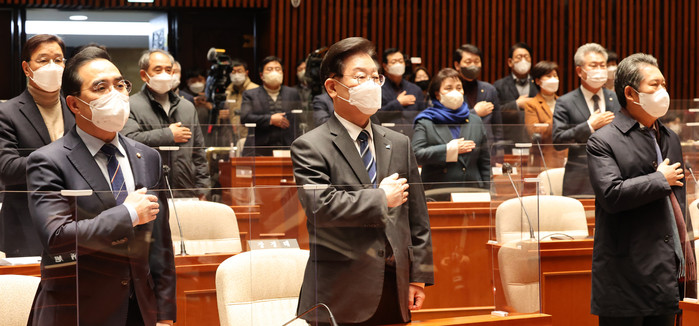 | ▲ 더불어민주당 이재명 대표와 박홍근 원내대표 등 참석 의원들이 7일 국회에서 열린 의원총회에서 국민의례를 하고 있다. 2022.12.7 |