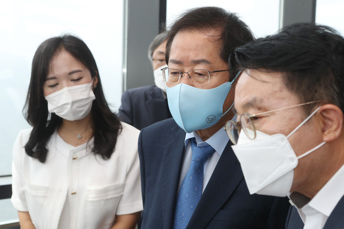 | ▲ 국민의힘 대권 주자인 홍준표 의원이 26일 오전 전북 김제시 새만금33센터를 방문, 새만금사업 전반에 대한 설명을 듣고 있다. 2021.8.26 [연합뉴스 제공] |