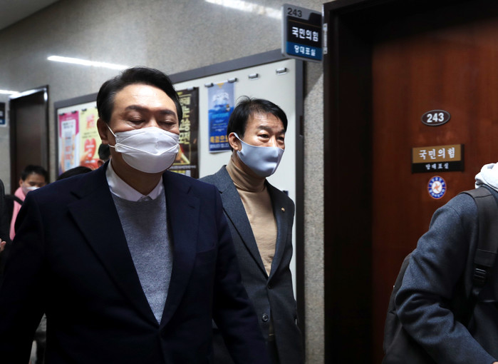 | ▲ 국민의힘 윤석열 대선 후보가 6일 국회 본청에서 열린 국민의힘 의원총회 참석을 마치고 이준석 당대표가 머물고 있는 당대표실 앞을 지나가고 있다. 이 대표는 의원총회에 불참했다. 2022.1.6 [국회사진기자단] |