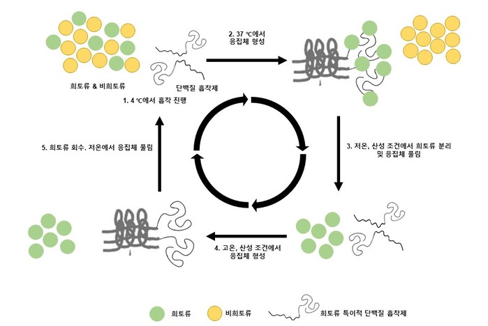 광주과학기술원 권인찬 교수 연구팀은 희토류에 선택적으로 붙었다가 떨어지는 특성의 단백질과 온도에 따라 뭉쳐지거나 풀리는 성질의 단백질을 융합했다.