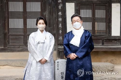 | ▲ 더불어민주당 이재명 대선 후보가 부인 김혜경 씨와 함께 설 명절인 1일 경북 안동시 안동 김씨 화수회를 방문, 기념촬영을 하고 있다. 2022.2.1 [더불어민주당 선대위 제공. 재판매 및 DB금지] |