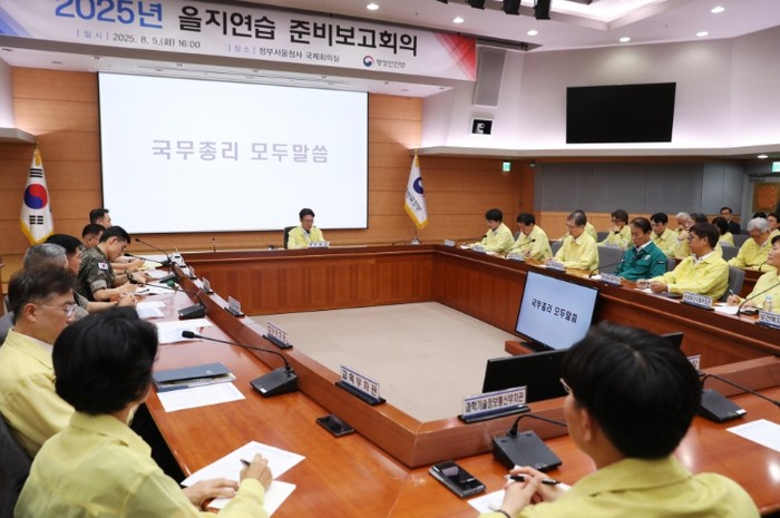 [코리아 이슈저널=최성일 기자] 김민석 국무총리는 8월 5일 오후 정부서울청사에서 중앙행정기관장, 시·도지사, 군 지휘관 등이 참석한 가운데 2025년도 을지연습 준비보고회의를 주재했다.