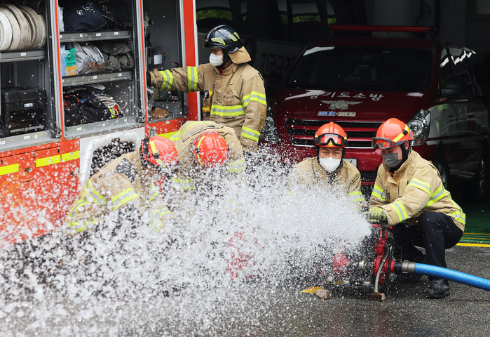 [열린의정뉴스 = 김윤영 기자] 20일 오전 경기도 수원시 권선구 수원남부소방서에서 소방관들이 장마를 앞두고 침수 사고 등에 대비해 동력펌프 등 장비를 점검하고 있다. 2022.6.20