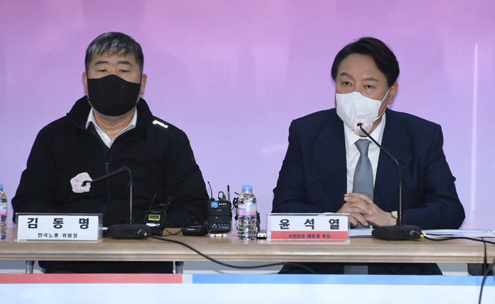 | ▲ 국민의힘 윤석열 대선 후보가 지난 12월 15일 오전 서울 여의도 한국노총에서 김동명 위원장 등 노총 관계자들이 참석한 가운데 정책간담회를 하고 있다. [국회사진기자단] |
