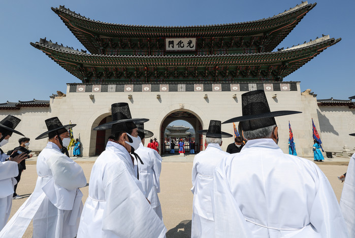[열린의정뉴스 = 김윤영 기자] 4일 오후 서울 경복궁 사정전(思政殿) 내 만춘전(萬春殿) 앞에서 열린 제3회 퇴계 선생 귀향길 걷기 '퇴계의 길에서 길을 묻다' 개막식을 마친 참가자들이 도포와 갓을 차려입고 출발해 경복궁 광화문 앞을 지나고 있다.