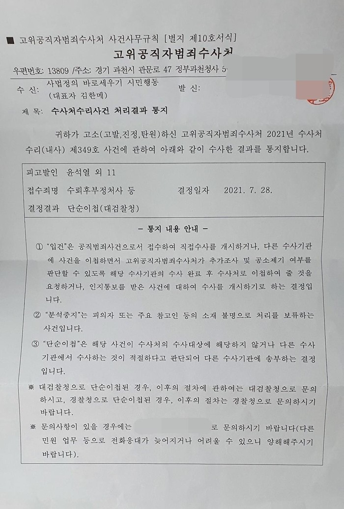 | ▲ 고위공직자범죄수사처 단순이첩 통지서 [사법정의바로세우기시민행동 제공] |