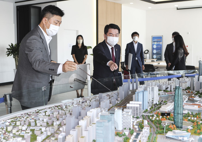 | ▲ 국민의힘 안철수 의원이 23일 오전 부산항 국제여객터미널 하늘공원에서 2030 부산엑스포 부지를 살펴보며 북항 통합개발 사업에 관해 설명을 듣고 있다. 2022.9.23 |