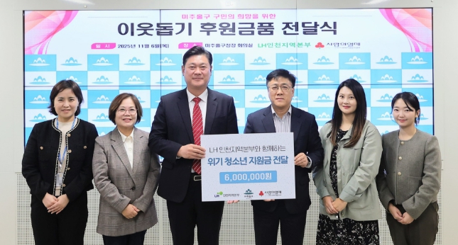 [코리아 이슈저널=홍춘표 기자] 인천 미추홀구는 6일 구청장실에서 한국토지주택공사(LH) 인천지역본부(본부장 서환식)로부터 아동복지시설 지원을 위한 온누리상품권 600만 원을 전달받았다.