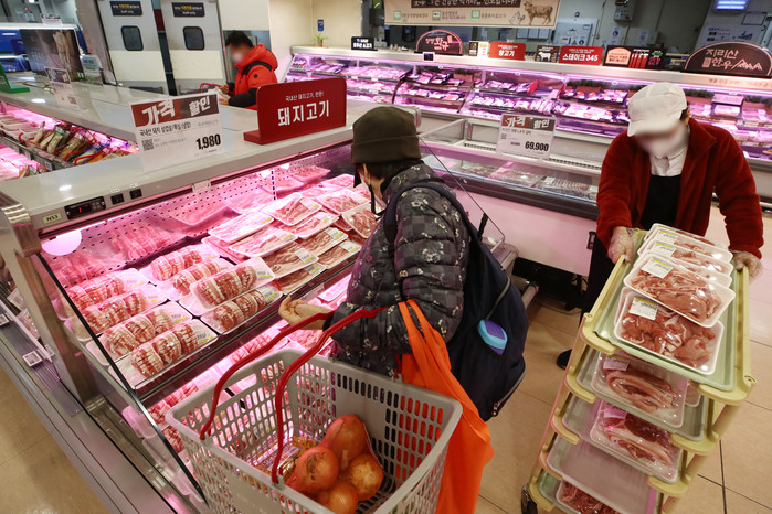 [열린의정뉴스 = 김윤영 기자] 농림축산식품부는 설 물가를 안정시키기 위해 명절 수요가 많은 쌀과 배추, 무, 소·돼지고기 등 16대 설 성수품을 이달 28일까지 역대 최대 물량인 20만4천t(톤)을 공급한다. 특히 배추·무·사과·배 등 성수품은 평시 대비 공급물량을 1.5~2.5배 확대한다. 사진은 10일 서울 시내 한 대형마트에서 돼지고기를 구매하는 시민. 2022.1.10