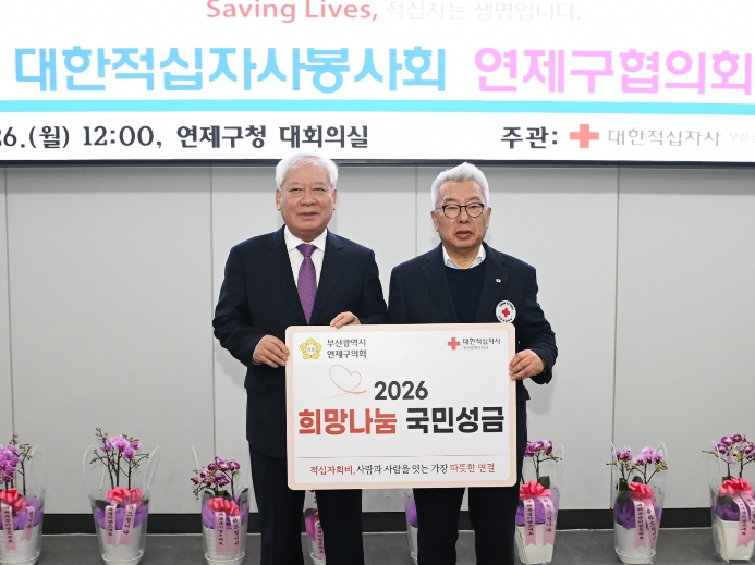 [코리아 이슈저널=김태훈 기자] 부산광역시 연제구의회는 지난 1월 26일 2026년도 적십자 특별회비를 대한적십자사 부산지사 측에 전달했다. 이는 지역 내 취약계층에 온정을 나누고 나눔문화 확산에 기여하기 위한 것으로 연제구의회는 해마다 적십자 특별회비 납부에 적극 동참하고 있다. 권종헌 의장은 "우리의 작은 나눔이 어려운 분들에게 희망을 불어넣는 계기가 되길 바란다”며 “연제구의회도 이웃과 함께하는 따뜻한 지역사회를 만들어가기 위해 최선을 다하겠다”고 말했다.