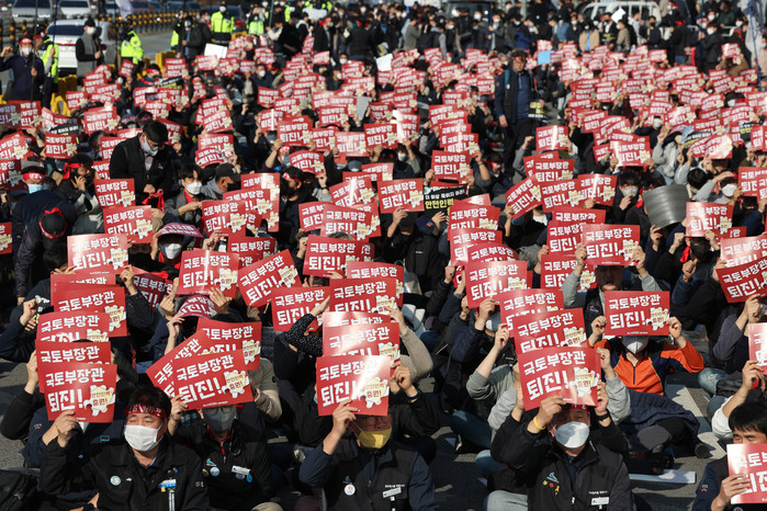 [열린의정뉴스 = 김윤영 기자] 전국철도노조 서울지방본부 조합원들이 18일 서울역 인근에서 총파업 결의대회를 열고 안전인력 충원, 국토교통부 장관 퇴진 등을 촉구하고 있다. 2022.11.18