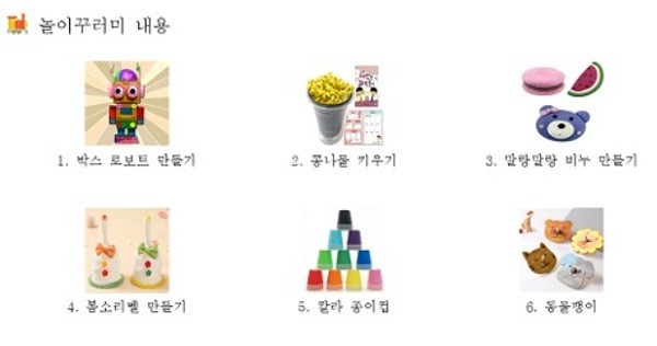 놀이꾸러미는 ▶박스 로봇 만들기 ▶콩나물 키우기 ▶말랑말랑 비누 만들기 ▶봄소리벨 만들기 ▶컬러 종이컵 ▶동물 팽이로 총 6종류로 구성됐다.