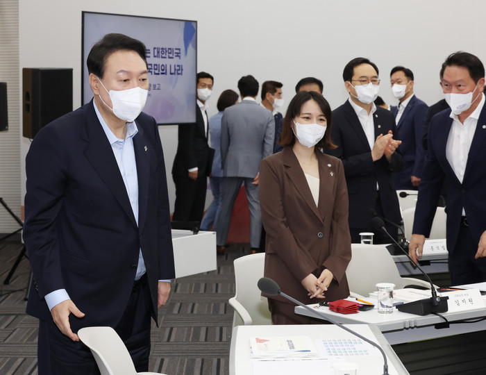 | ▲ 윤석열 대통령이 16일 오전 경기도 성남시 판교 제2테크노밸리 기업성장센터에서 열린 새정부 경제정책방향 발표 회의에 입장하고 있다. 2022.6.16 |