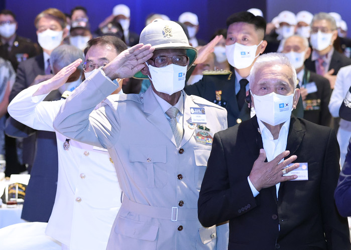 [열린의정뉴스 = 김윤영 기자] 6ㆍ25전쟁 72주년을 하루 앞둔 24일 서울 중구 신라호텔에서 열린 국군 및 유엔군 참전유공자 초청 오찬에서 테페라 네구시 모루(가운데. 에티오피아 당시 칵뉴부대 소령), 그레고리오 비세날 록사스(필리핀, 당시 육군 상병) 참전용사가 국기에 경례를 하고 있다. 2022.6.24