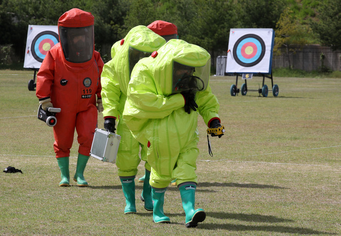[열린의정뉴스 = 김윤영 기자] 27일 오후 광주 국제양궁장에서 열린 테러대비태세 점검 및 대응 역량 강화를 위한 광주경찰청 등 14개 관계기관의 합동훈련에서 화생방 탐지 및 제독 훈련하고 있다. 2022.4.27