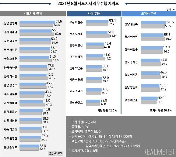 리얼미터가 지난달 28일부터 이달 1일까지 전국 만 18세 이상 1만7천명을 대상으로 지역별로 조사해 8일 발표한 8월 지지도 조사에서 김 지사는 전달보다 3.1%포인트 오른 61.6%로 가장 높았다.