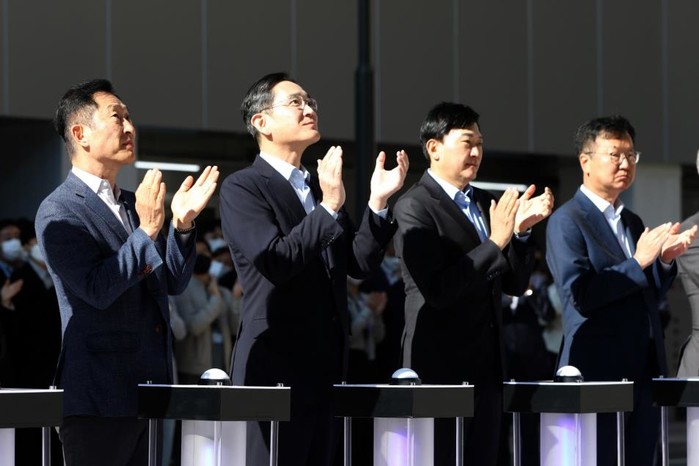 | ▲ 이재용 삼성전자 부회장(왼쪽에서 두번째)이 11일 세계 최대 바이오의약품 생산 시설인 삼성바이오로직스 제4공장 준공식에 참석했다. 사진 왼쪽부터 고한승 삼성바이오에피스 사장, 이재용 부회장, 존 림 삼성바이오로직스 사장, 최성안 삼성엔지니어링 사장. 2022.10.11. [삼성전자 제공. 재판매 및 DB 금지] |
