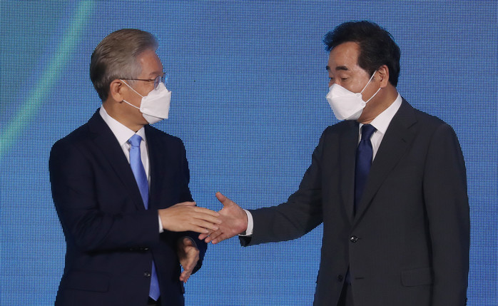| ▲ 더불어민주당 이재명(왼쪽), 이낙연 대선 경선 후보가 3일 인천 연수구 송도컨벤시아에서 열린 인천 순회합동연설회 및 2차 슈퍼위크 행사에서 결과 발표 후 악수하고 있다. 2021.10.3 [국회사진기자단] |