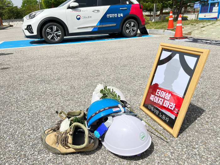 [열린의정뉴스 = 김윤영 기자] 27일 오전 강원 강릉시 고용노동부 강릉지청 앞에서 전국민주노동조합총연맹(민주노총) 강원지역본부 주최로 2022 강원도 최악의 살인기업 선정식 기자회견이 열려 기자회견장 앞에 영정과 안전모, 작업화, 국화꽃이 놓여 있다. 2022.4.27