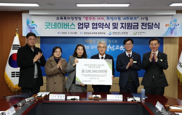 굿네이버스 경남사업본부는 이날 지원금 2억 2,656만 원을 전달했다. 경남교육청은 이 지원금을 교육복지안전망 사업에 투입해 도내 교육 취약 학생들을 돕는 데 소중히 쓸 계획이다.