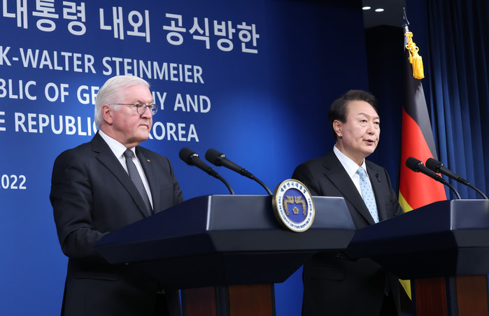 슈타인마이어 대통령은 "러시아의 우크라이나 침공이 일어난 시대에 긴밀한 파트너십은 더 중요하다"며 "한국 같은 경우는 국제사회에서도 인도·태평양 국가 중 아주 강력하고 분명하게 러시아 침공에 대해 (반대) 입장을 취했다"고 평가했다.