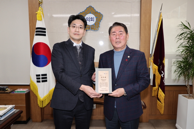 [코리아 이슈저널=홍춘표 기자] 영동군의회 신현광 의장이 국가유공자 우선주차구역 설치 및보훈예우문화 확산에 기여한 공로를 인정받아 국가보훈부 장관 감사패를 수상했다.