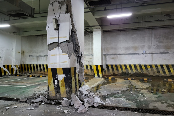 [열린의정뉴스 = 김윤영 기자] 31일 경기도 고양시 마두동의 한 상가 건물에서 지하 기둥 일부가 파열되는 사고가 일어났다. 사진은 사고 현장의 모습. 2021.12.31