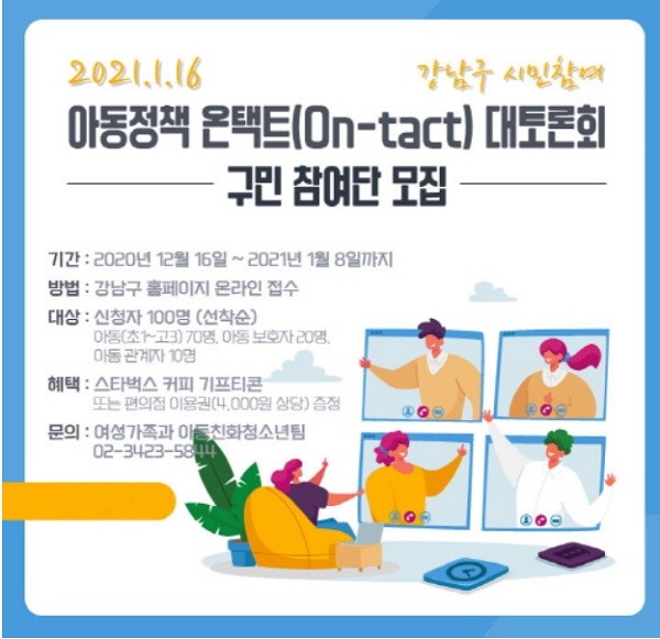이번 토론회는 화상회의 플랫폼 '줌(ZOOM)'을 이용한 비대면 방식으로 진행된다. 참가대상은 아동과 아동보호자, 관내 아동 관련 시설 종사자로, 신청은 내달 8일까지 강남구청 홈페이지(gangnam.go.kr)를 통해 할 수 있다. 참가자에게는 소정의 기프티콘이 제공된다.