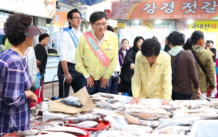 이날 진 군수는 시장 내 제수와 생활필수품 가격을 세심히 확인하며 상인들의 애로사항을 청취했다. 또한 장을 보러 나온 군민들과 일일이 인사를 나누며 전통시장 이용을 독려하고 추석 인사를 전했다.