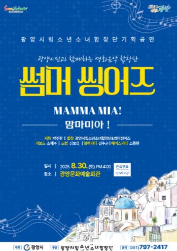 [코리아 이슈저널=김윤영 기자] 광양시립소년소녀합창단이 여름방학을 맞아 오는 8월 30일 오후 4시 광양문화예술회관 대공연장에서 기획공연 ‘썸머씽어즈–맘마미아!’를 선보인다.