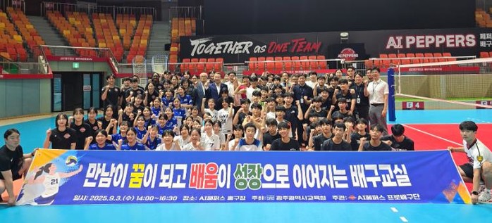 [코리아 이슈저널=김종오 기자] 광주시교육청과 페퍼저축은행 AI 페퍼스 배구단은 3일 페퍼 스타디움에서 ‘학교스포츠클럽 배구교실’을 운영했다.