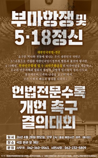 [코리아 이슈저널=김종오 기자] 광주광역시는 오는 28일 오후 2시 국회 본관 앞에서 개헌안 가결을 위한 정치권의 결단을 촉구하는 ‘부마항쟁 및 5·18정신 헌법 전문 수록 개헌 촉구 국민결의대회’가 열린다고 밝혔다.