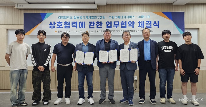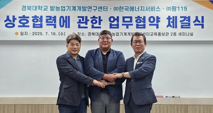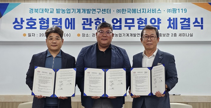 [코리아 이슈저널=최준석 기자] 경북대학교 밭농업기계개발연구센터에서 7월 16일(화) 오전 11시, 농업 분야의 지속가능성과 혁신을 이끌기 위한 산학연 업무협약(MOU) 체결식이 열렸다. 이날 협약은 경북대학교, ㈜한국에너지서비스, ㈜119팜 등 3개 기관이 참여한 가운데 진행됐으며, 각 기관은 영농형 태양광 시스템과 친환경 방제 기술, 농업 에너지 효율화 기술의 공동 개발 및 실증을 통해 탄소 중립형 농생명 시스템 구축에 협력하기로 합의했다.